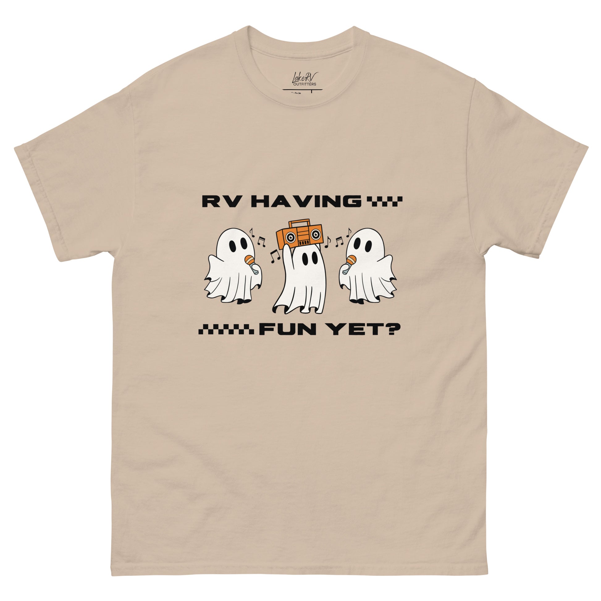 RV having fun yet? These ghosts certainly are! Whether you're a seasoned road tripper or just a Halloween enthusiast, this shirt is designed to capture the essence of both worlds in a unique and fun way.